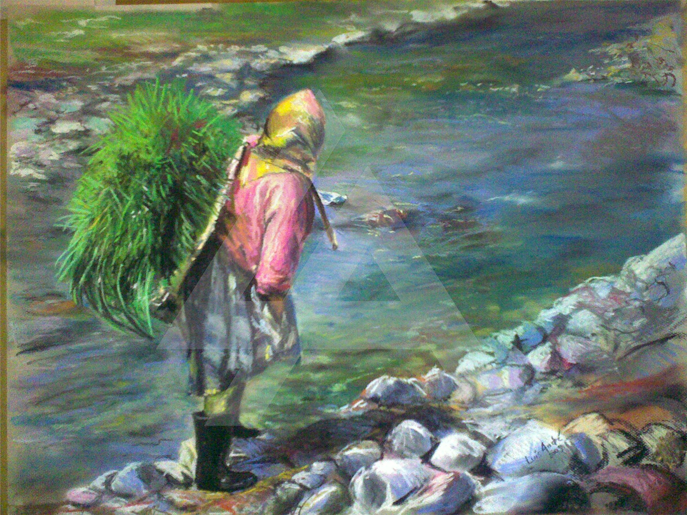 Aos pés do Monte Átlas há uma região incrível chamada “Ourika Valley”. Lá, encontramos um grupo de mulheres camponesas, onde cada uma carregava um feixe de capim para alimentar seus rebanhos. Apenas a anciã, que liderava o grupo atravessou o rio e deixou-se ser fotografada por nós, o restante do grupo, sentou nas pedras na outra margem do rio, e descansando, esperou nosso distanciamento.